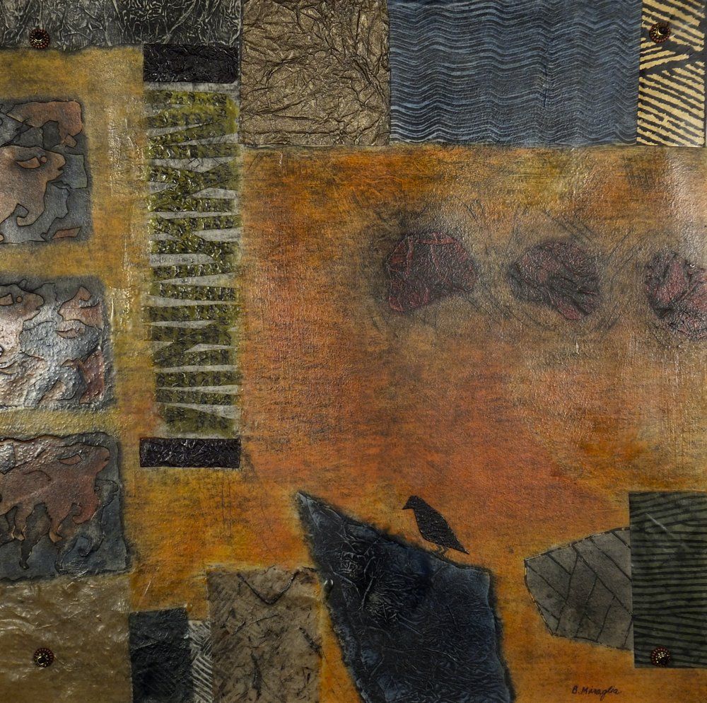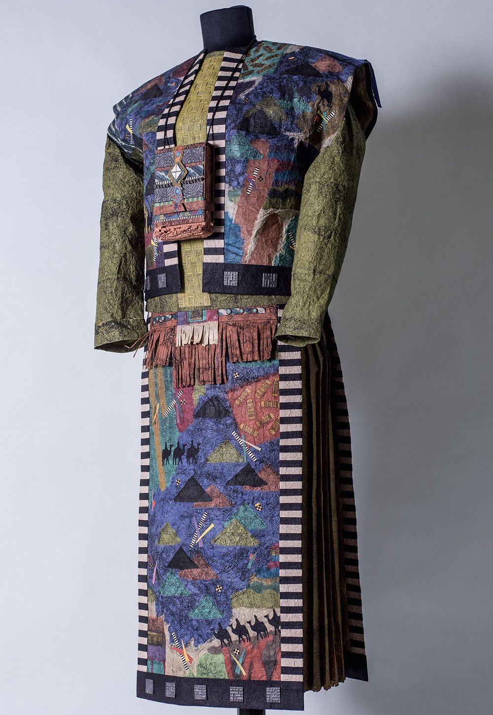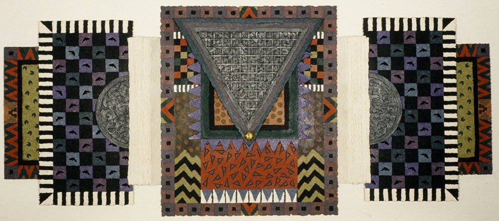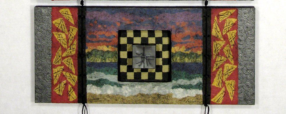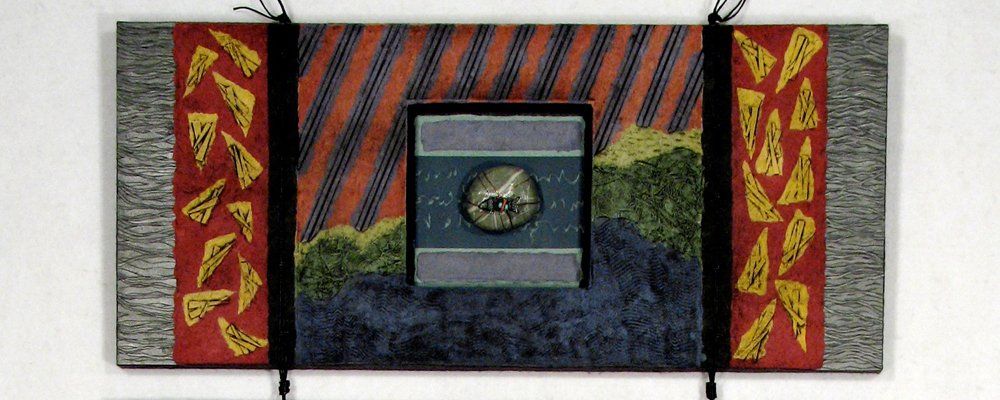 "I often go in less traditional, three dimensional directions in my artwork. While experimenting with paper as a “fabric", I created a three piece dress that is made with collagraph printed handmade papers that have been treated with Konnyaku paste, allowing the papers to form a wrinkled surface. Using a gentle rubbing technique, the sheets of paper become softer. These large wrinkled sheets are known as “momigami” paper. I then cut these sheets into pattern sections that will eventually be sewn and glued together to form my paper garment. Other two and three demential work is completed in a similar technique.”
