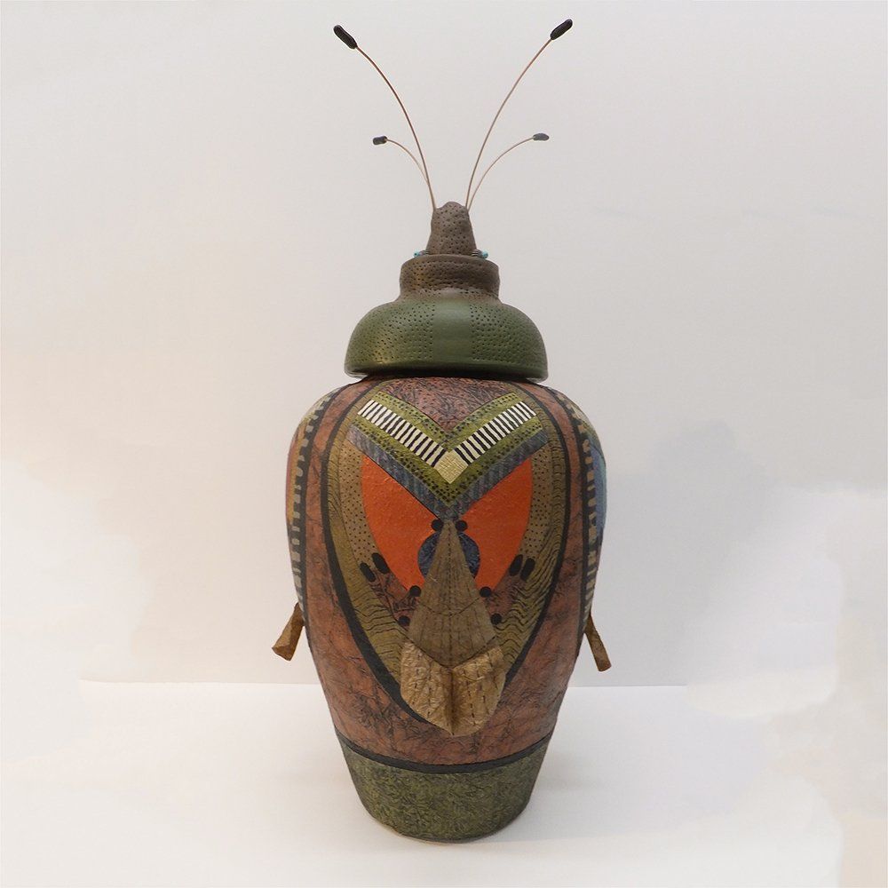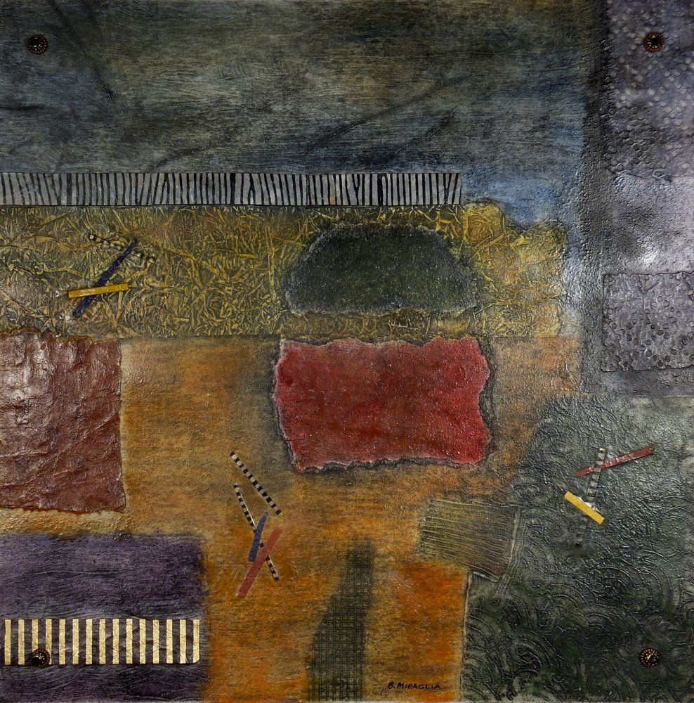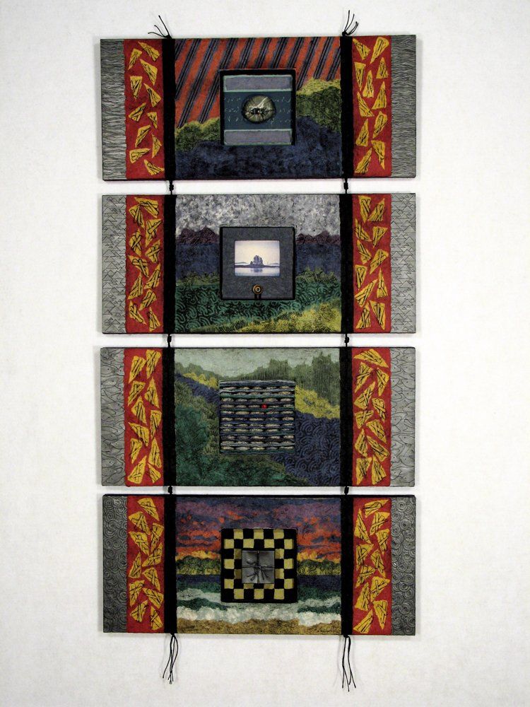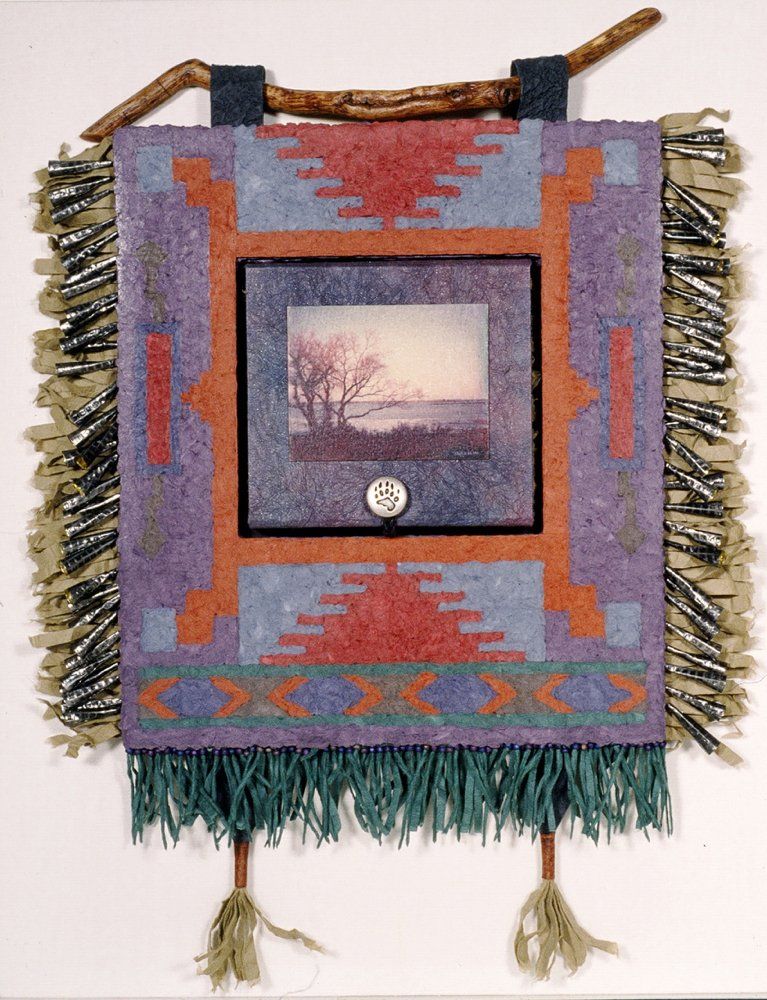 "I often go in less traditional, three dimensional directions in my artwork. While experimenting with paper as a “fabric", I created a three piece dress that is made with collagraph printed handmade papers that have been treated with Konnyaku paste, allowing the papers to form a wrinkled surface. Using a gentle rubbing technique, the sheets of paper become softer. These large wrinkled sheets are known as “momigami” paper. I then cut these sheets into pattern sections that will eventually be sewn and glued together to form my paper garment. Other two and three demential work is completed in a similar technique.”